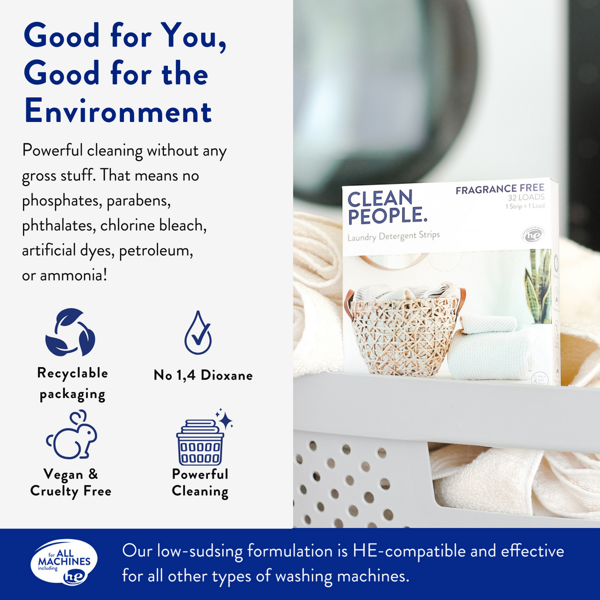 - GOOD FOR YOU, GOOD FOR THE ENVIRONMENT: Our eco friendly detergent is smaller and lighter than that yucky traditional laundry detergent sold in plastic packaging. Clean People comes in recyclable paper packaging, so no more plastic jugs in the landfill and no phosphates, parabens, phthalates, chlorine bleach, artificial dyes, or ammonia in your laundry!